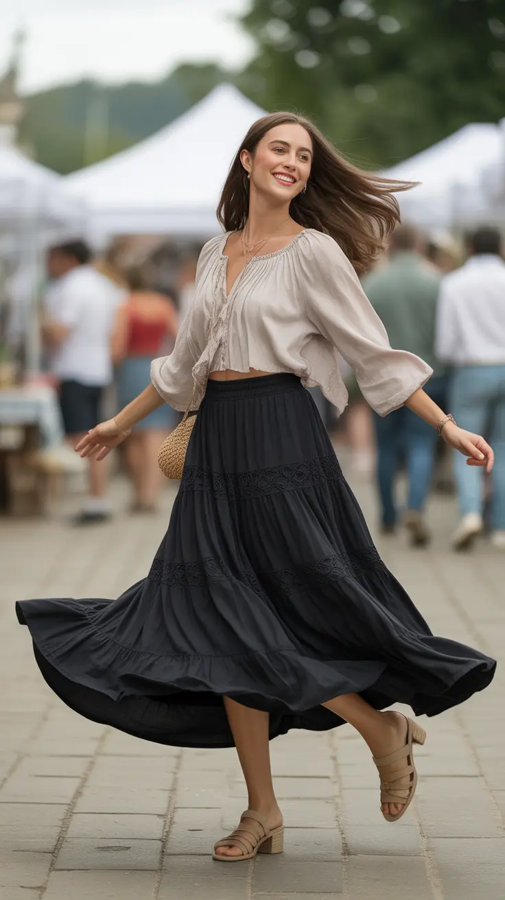 The model pairs her flowing black skirt with a vibrant, patterned top that adds a pop of color. This combination not only looks great but also keeps things comfortable. Layering necklaces and wearing bold earrings create a fun, bohemian vibe that’s perfect for a festival atmosphere.
