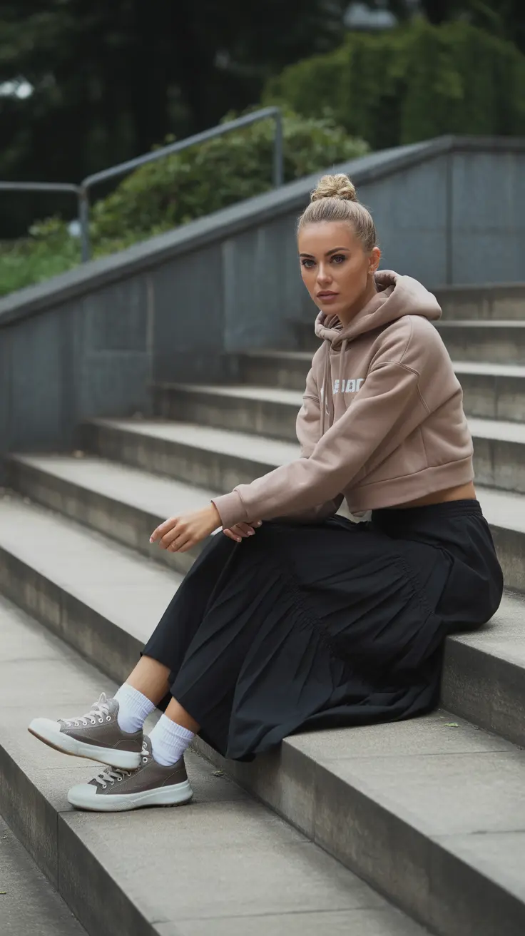 The black maxi skirt serves as a versatile base, allowing you to mix and match with various tops. Here, the hoodie adds a casual vibe, making it ideal for a day out or a relaxed gathering with friends. This outfit inspo is great for those who want to look stylish without putting in too much effort.