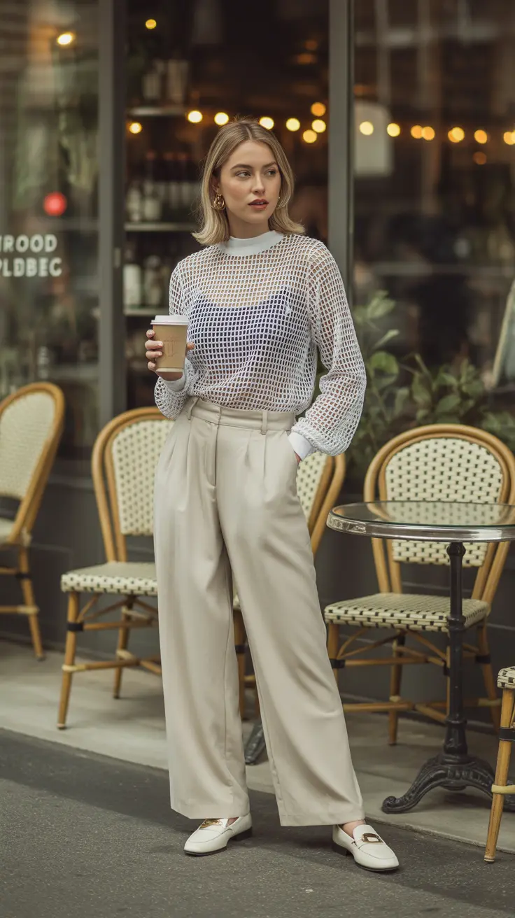 12. Mesh Long Sleeve Top Outfit With Wide-Leg Slacks And Loafers