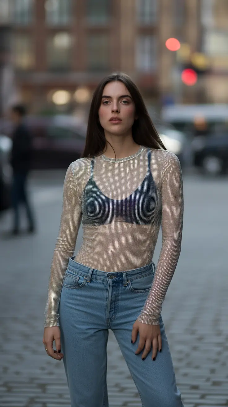 In this look, the model showcases how a sheer top outfit can be both trendy and wearable. The straight jeans keep the outfit grounded, allowing the metallic texture to shine without overwhelming the overall vibe. This combination is perfect for those who want to experiment with trendy street style looks while staying comfortable.