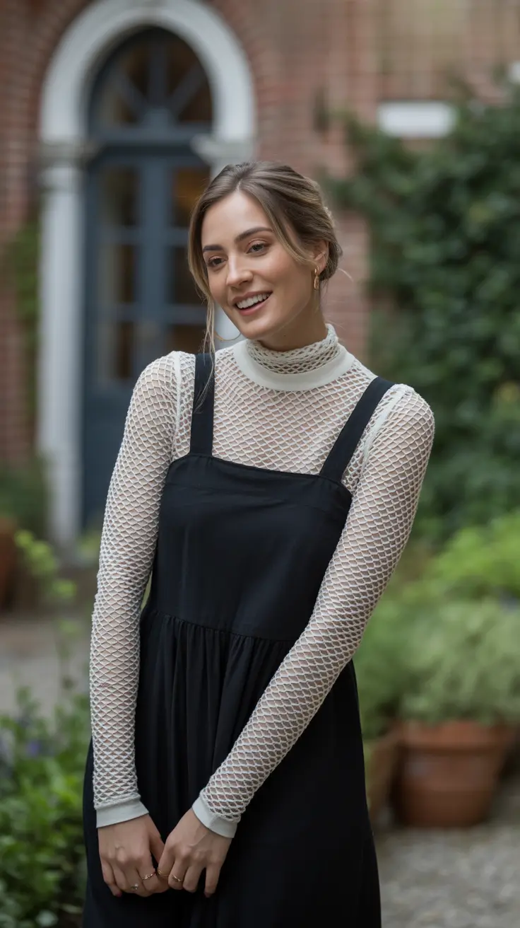Layering is a fun way to express your style, and pairing a mesh long sleeve top under a pinafore dress is a trendy choice. This look combines the edgy vibe of sheer fabrics with the playful nature of a pinafore. The mesh top adds a hint of allure while keeping things casual and comfortable.