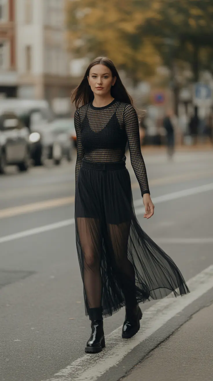 Pairing this outfit with knee-high boots and a small crossbody bag enhances the street style vibe. It’s a chic way to embrace sheer top outfit ideas while staying comfortable. Whether you’re heading to brunch or a night event, this look is sure to turn heads.