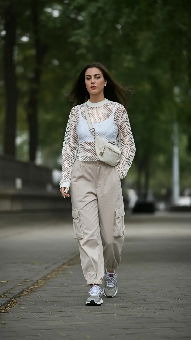 The white mesh long sleeve top paired with cargo pants creates a stylish and edgy look. This outfit strikes a balance between casual and chic, making it perfect for various occasions.
