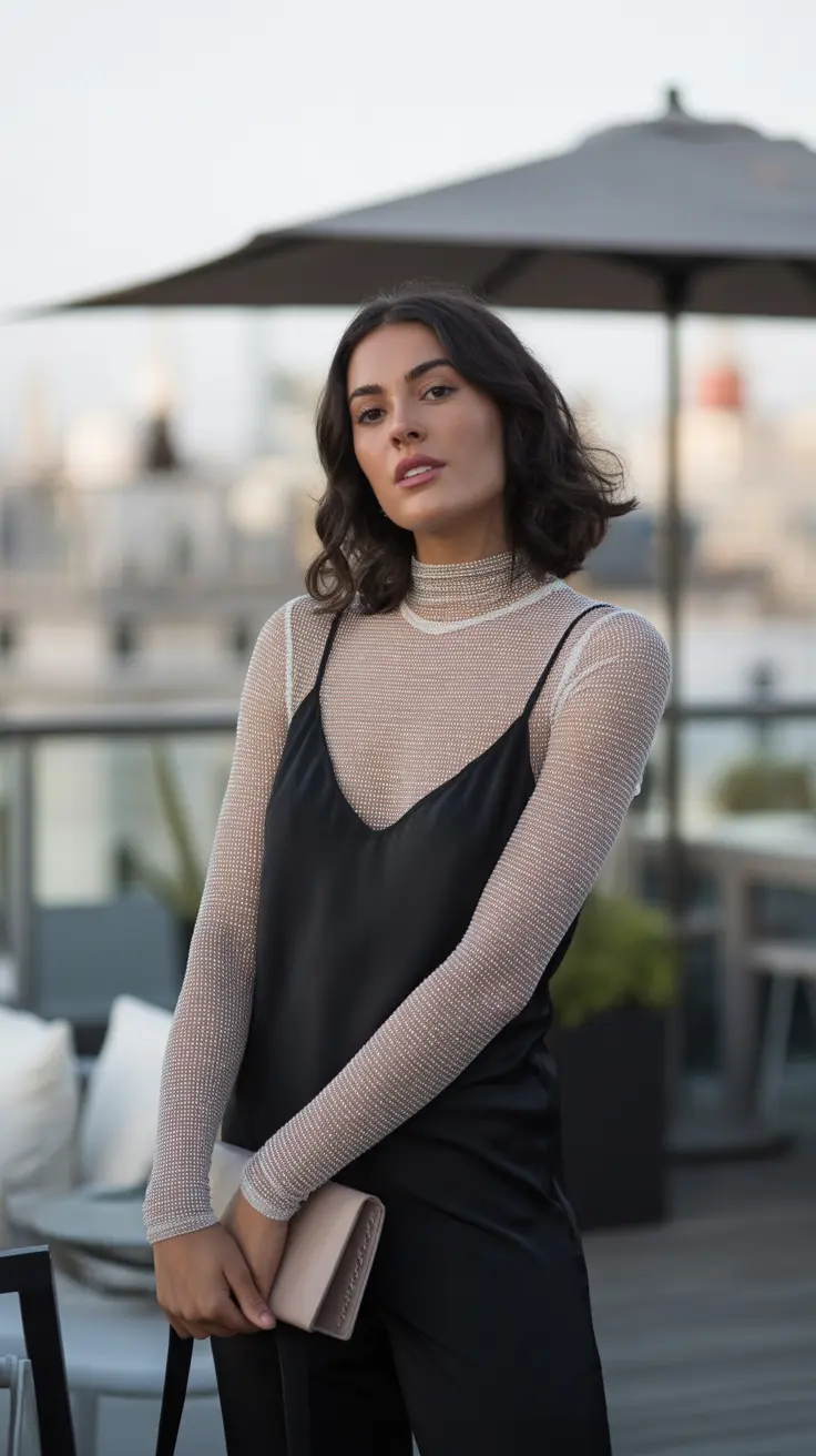 Layering is a fun way to add depth to your outfit, and a sheer mesh long sleeve top under a slip dress is a perfect example. This look combines edginess with elegance, making it ideal for various occasions.