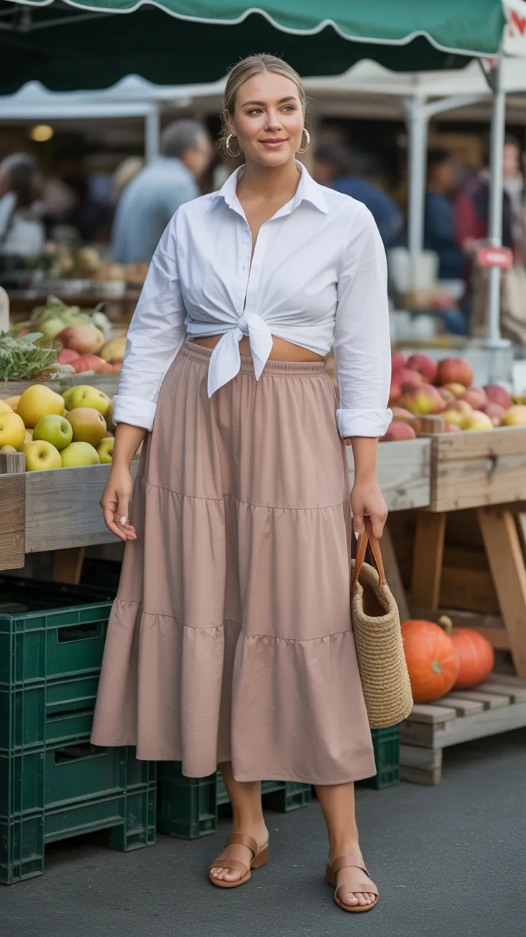 A tied button-down shirt paired with a tiered midi skirt is a fantastic choice for mid size outfits. This look combines comfort and style, making it perfect for any casual outing. The flowy skirt adds a touch of flair, while the tied top highlights your waist, creating a flattering silhouette that embraces the mid size aesthetic.