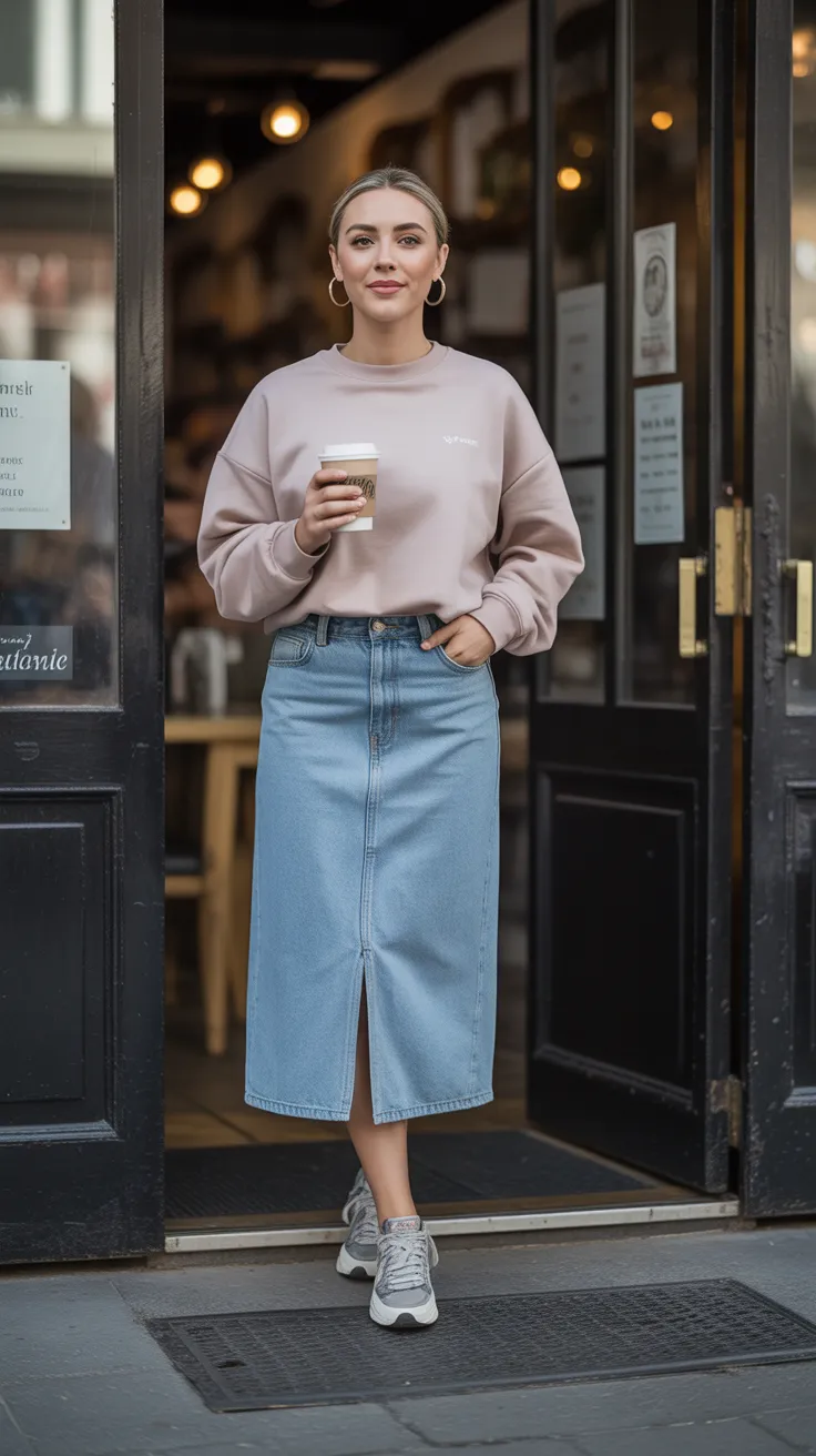 Denim Midi Skirt With Boxy Crewneck Sweatshirt