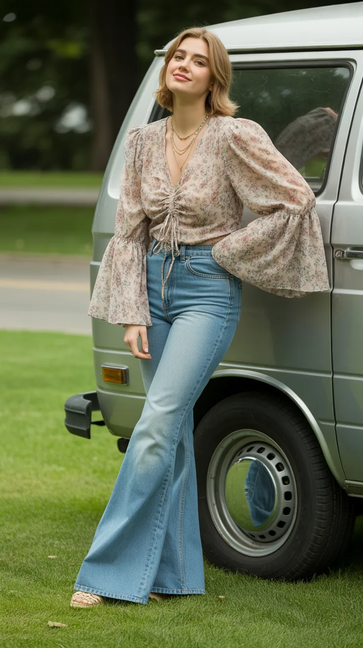 The mode hippie look is a fun way to express your personal style. Pairing bell sleeves with flared jeans creates a flattering silhouette that works well for midsize body outfits. This combination is perfect for anyone looking to embrace mid-sized fashion with a laid-back vibe.