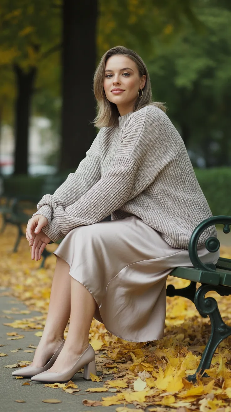 This outfit perfectly blends comfort and style. The slouchy knit sweater adds a cozy vibe, while the satin slip skirt brings a touch of elegance. It’s a great choice for anyone looking to showcase their mid size aesthetic with ease.