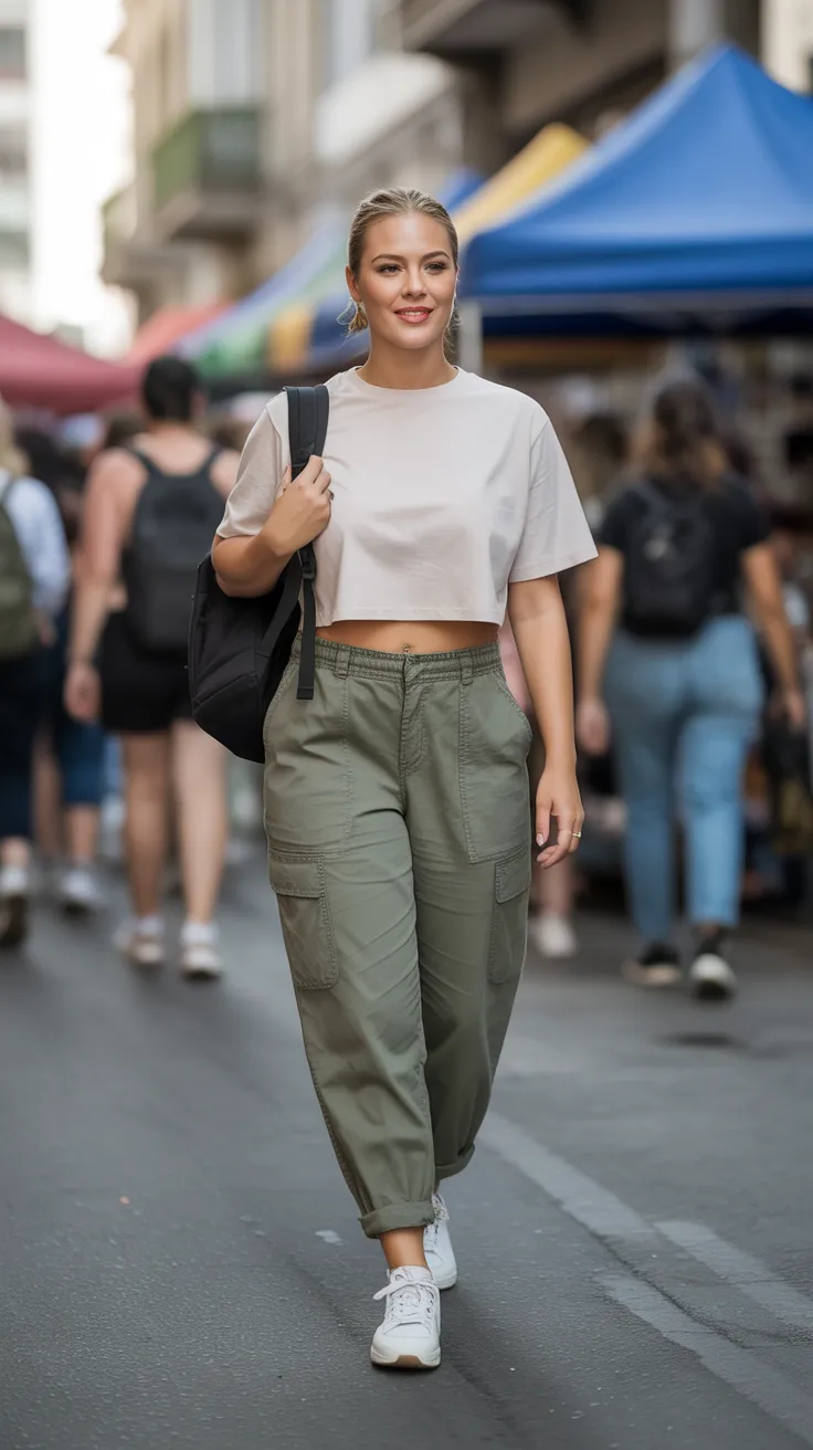 The boxy cropped tee paired with utility pants is a fresh take on mid size outfits. This look is both comfy and stylish, making it perfect for everyday wear. Embrace the mid size aesthetic with this effortlessly cool combo that showcases your personal style.
