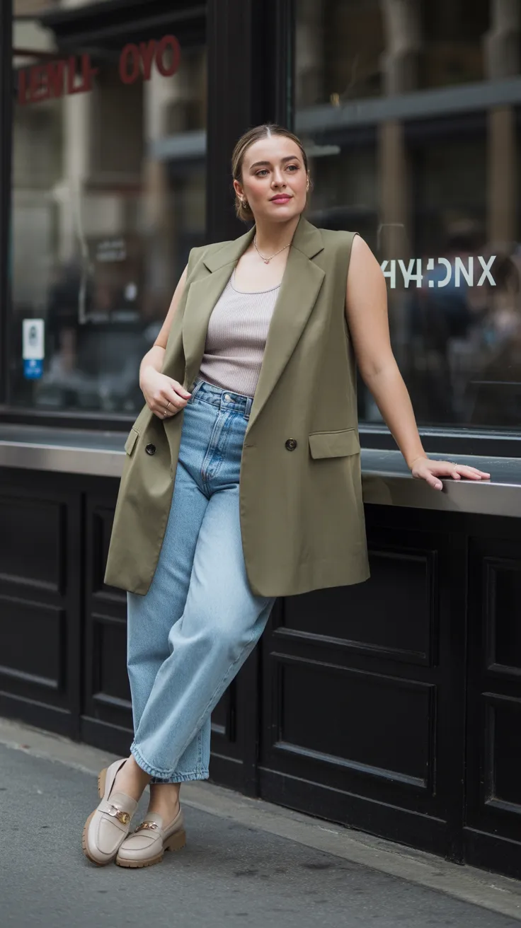 This look is perfect for anyone embracing the mid size aesthetic. An oversized vest layered over a simple ribbed tank and paired with jeans creates a relaxed yet stylish vibe. It’s a go-to outfit that showcases personal style while being super flattering for mid sized fashion.