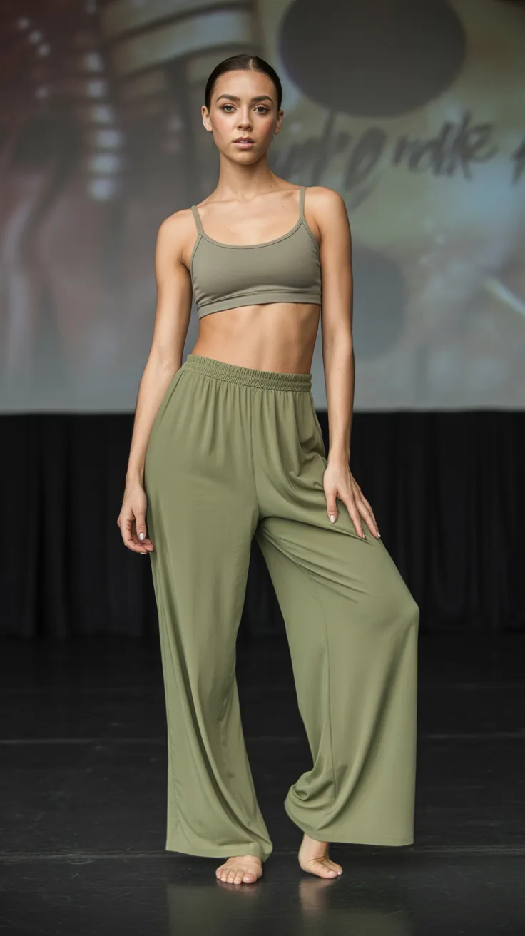 When it comes to modern dance outfits, comfort and style go hand in hand. The olive green flowy pants paired with a fitted bra top create a perfect blend of both. The loose fit of the pants allows for unrestricted movement, making them ideal for any dance routine.