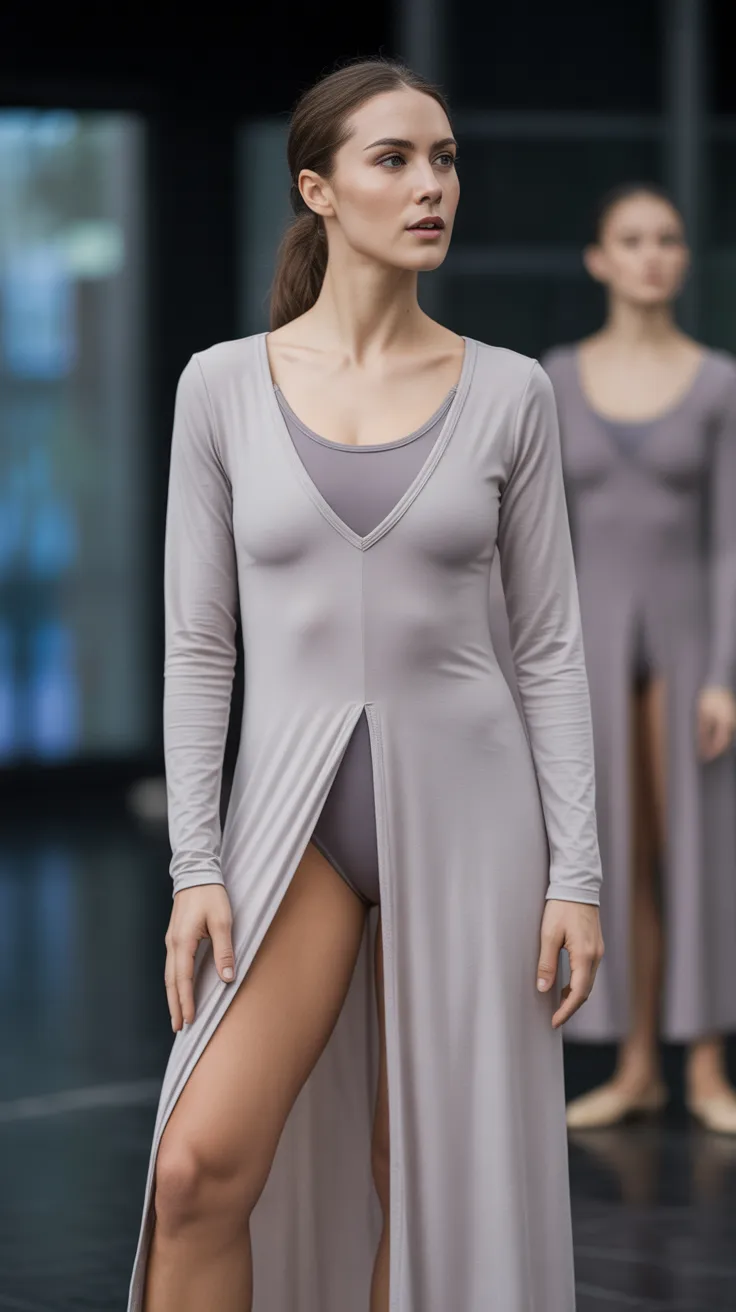 The long tunic top with a slit over a leotard is a stylish choice for modern dance outfits. This look combines elegance with functionality, making it perfect for both practice and performance.