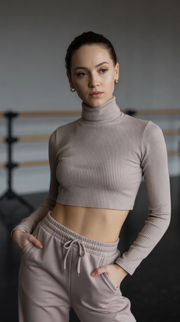 The ribbed turtleneck crop paired with jogger pants is a stylish choice for modern dance outfits. This combo strikes a balance between comfort and performance, making it perfect for any dance session.