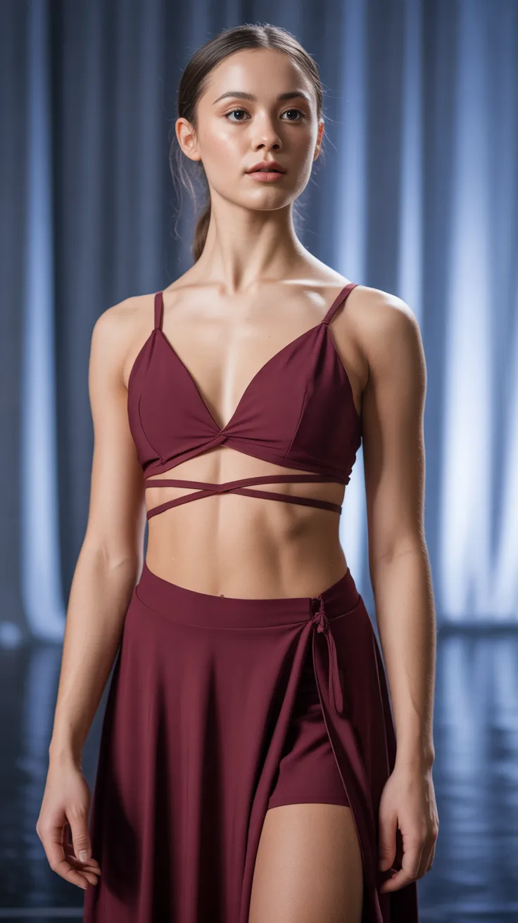 The maroon bra top paired with a wrap skirt is a stunning choice for modern dance outfits. This combination not only looks stylish but also allows for freedom of movement, making it perfect for various dance styles.