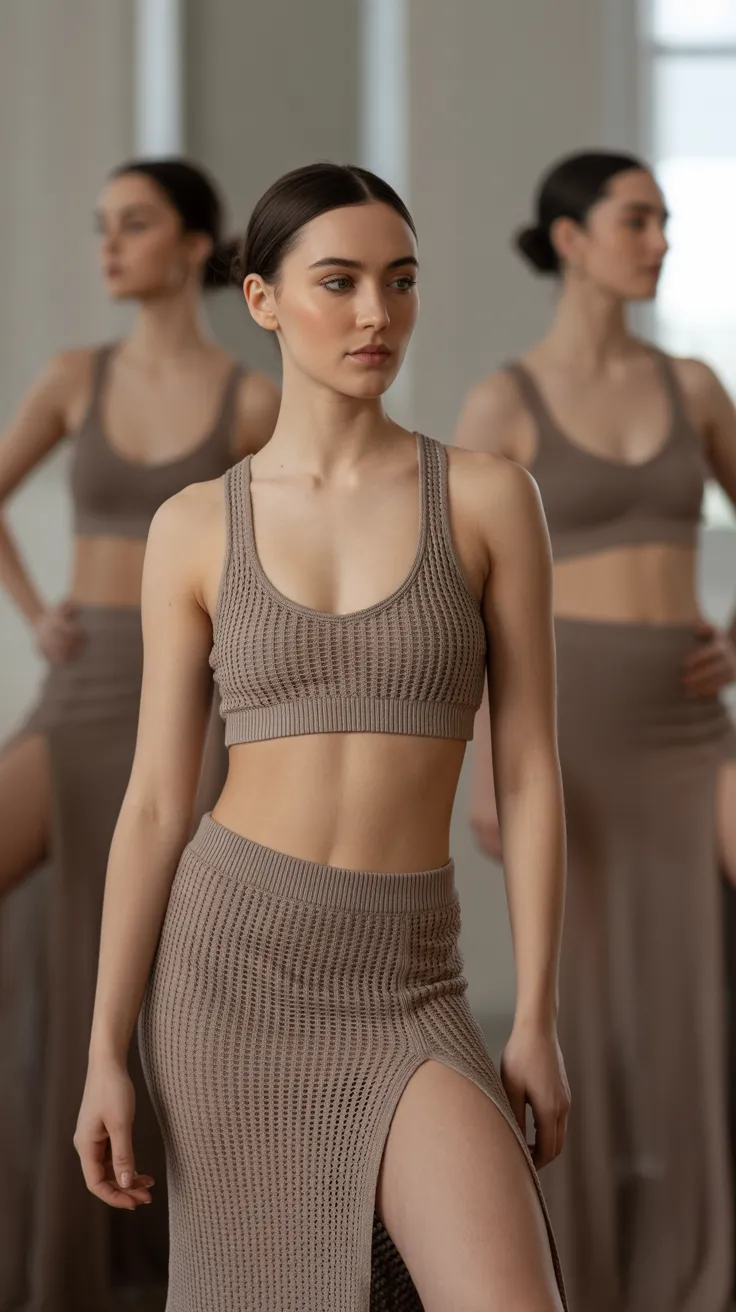 This earth-toned knit bra and split skirt set is a fresh take on modern dance outfits. The combination of a cozy knit top and a flowing skirt creates a perfect balance of style and comfort.