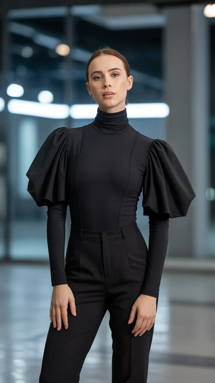 21. Black Turtleneck Unitard With Dramatic Sleeves