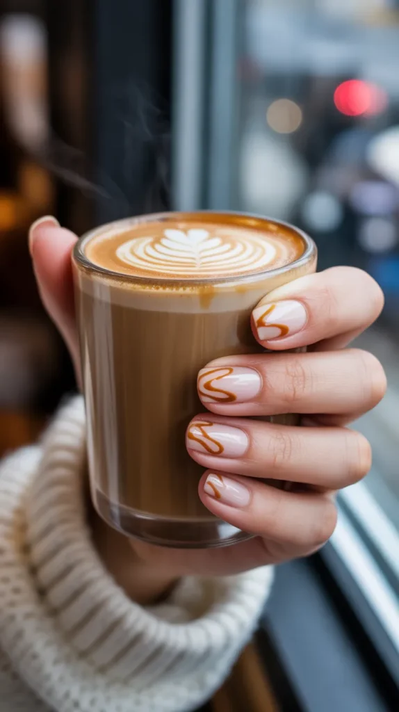 Caramel swirl nails are made for coffee lovers and cozy afternoons. The creamy beige base with warm caramel swirls adds delicious depth to your November nails. It’s playful, soft, and effortlessly elegant the kind of nails winter design that feels like autumn’s last hug. ☕