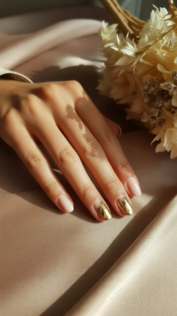 Copper foil nails bring warmth and shine in equal measure. The taupe base with delicate metallic foil gives a soft, radiant touch a must-try for nails winter metallic trends. Elegant yet easy to wear for any occasion. ✨
