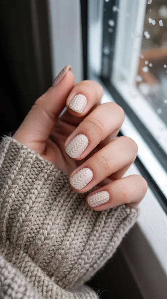 Beige knit texture nails bring cozy fashion straight to your fingertips. The embossed cable-knit effect looks adorable and on-trend for winter nails comfort. Perfect for sweater weather lovers. 🧶