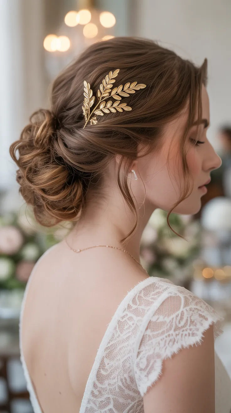 10. Loose Curly Updo With Gold Leaf Pin