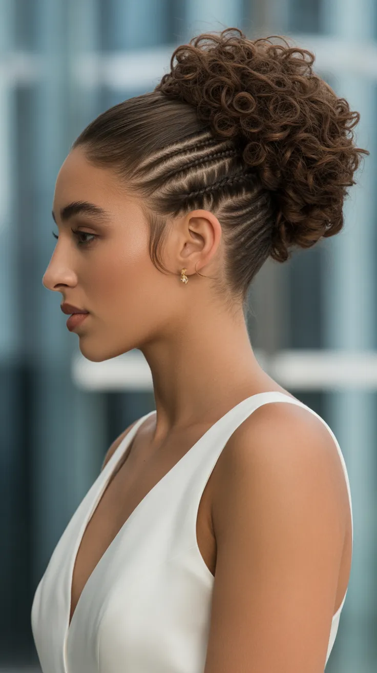 11. Defined Curly Bun With Side Cornrow Detail