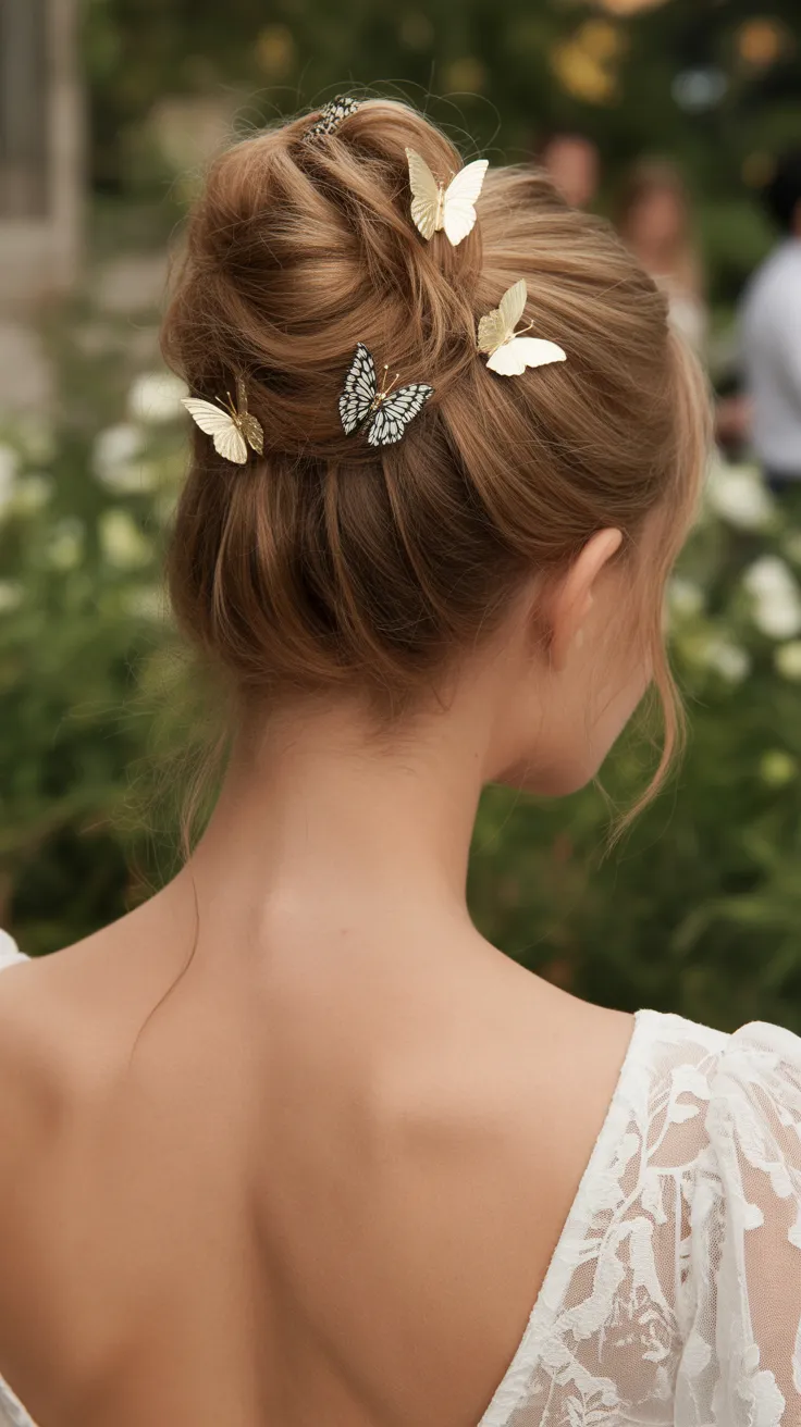 For those considering bridal hair accessories updo, this style is a fantastic option. The combination of a curly braided updo and butterfly accents brings a unique flair to traditional wedding hairstyles. A French bun can also be incorporated for added sophistication, making it versatile for various wedding themes.