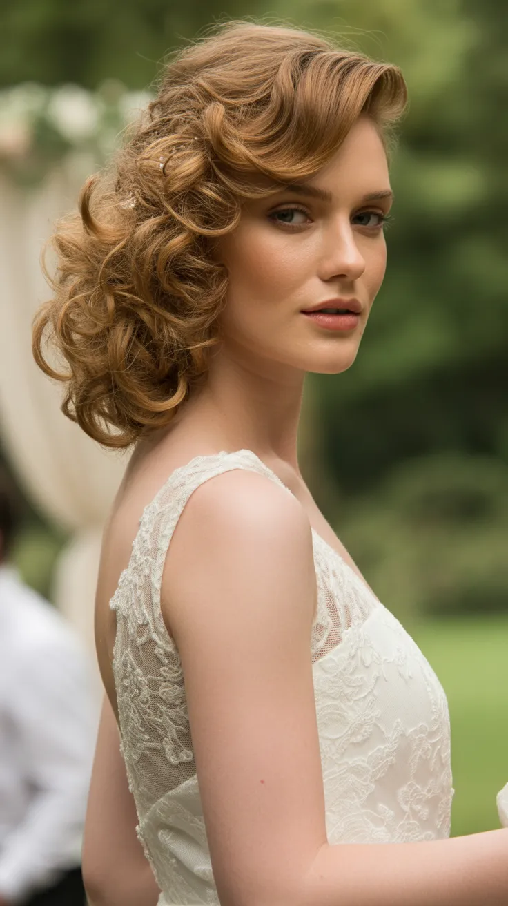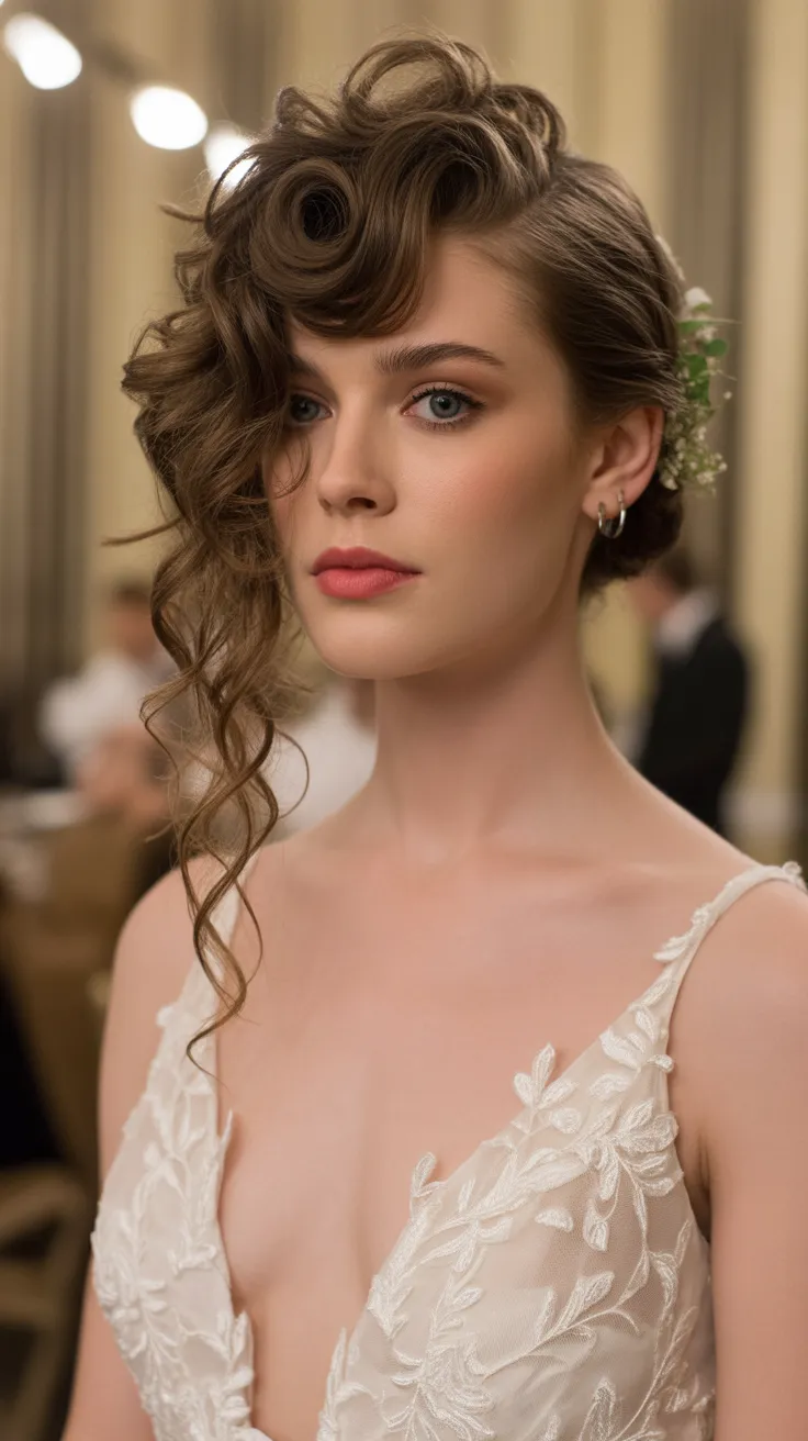 In this particular image, you can see how the curls are expertly styled to add height and volume. The side-swept effect draws attention to the bride’s features, while the cascading curls add a touch of whimsy. This look pairs well with bridal hair accessories updo, like delicate pins or floral accents, enhancing the overall charm.