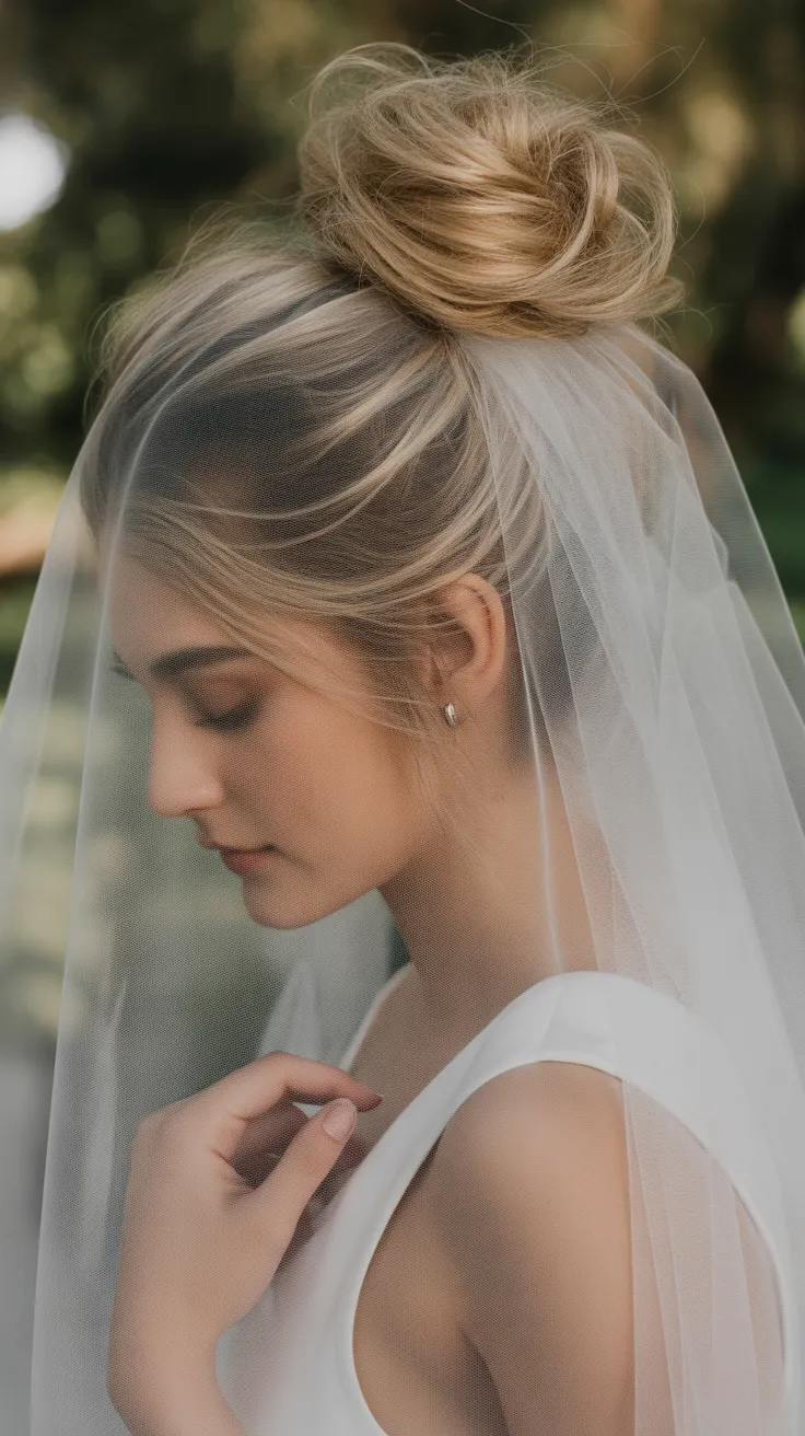 A sheer veil drapes gracefully, enhancing the overall look. It adds a romantic touch, making this style ideal for weddings. The veil complements the bun for wedding hair, creating a harmonious balance.