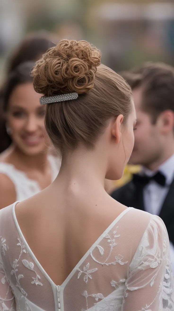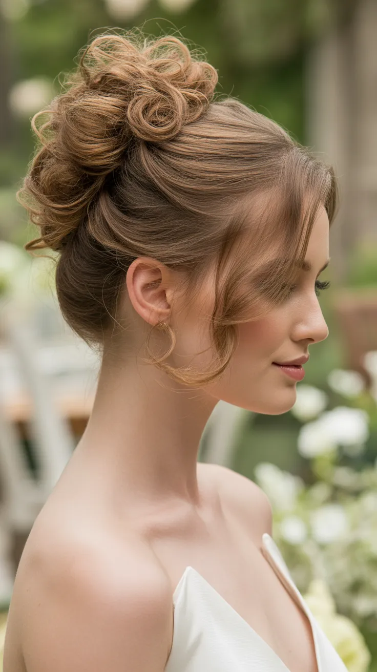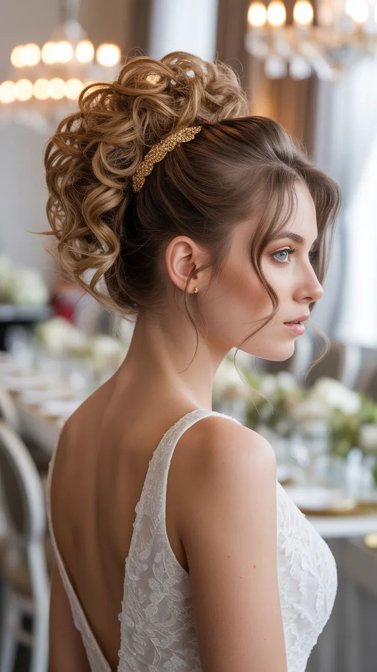This particular look features a voluminous bun at the back, adding height and drama. The soft curls cascading around the face enhance the romantic vibe, making it ideal for a curly updo bride. To elevate the style, consider adding bridal hair accessories updo, like delicate flowers or sparkling pins, which can add a touch of glamour.
