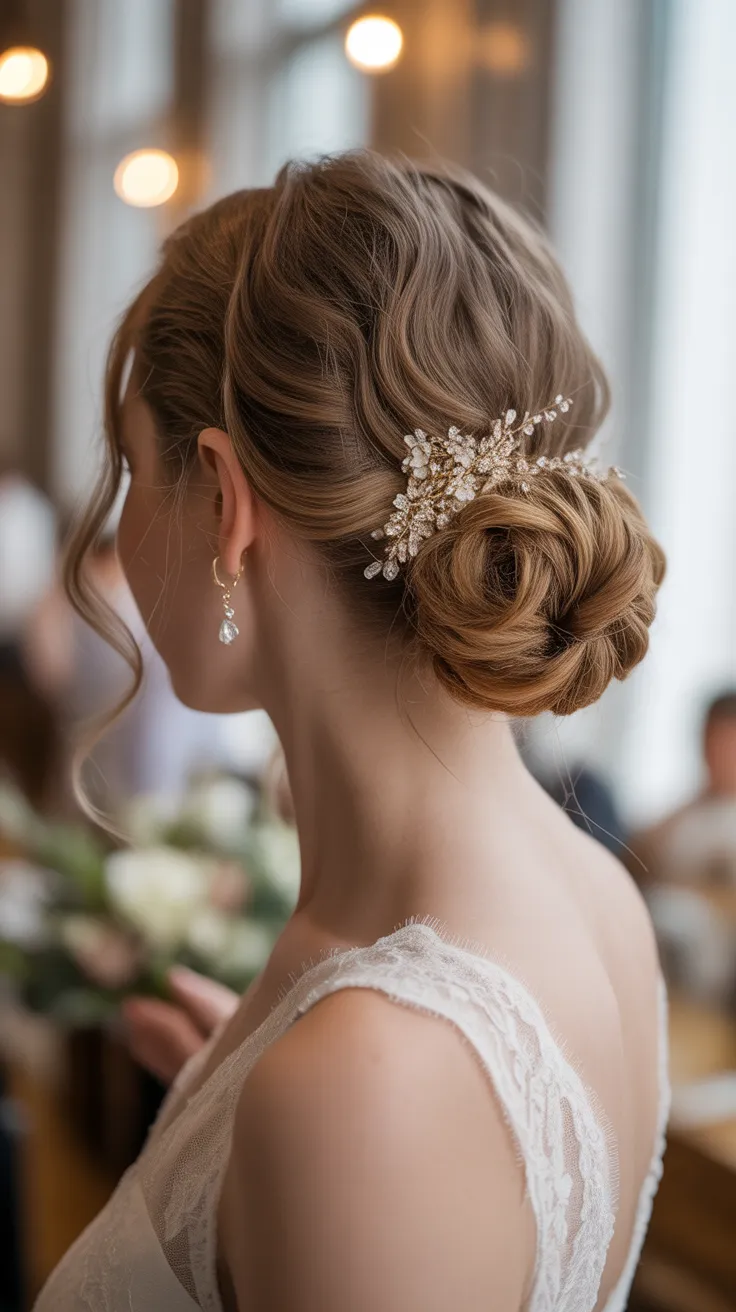 Adding delicate accessories can elevate this look even further. Pearls or small floral accents can bring a touch of romance, making the hairstyle feel special. These bridal hair accessories updo not only enhance the bun but also complement the overall wedding theme.