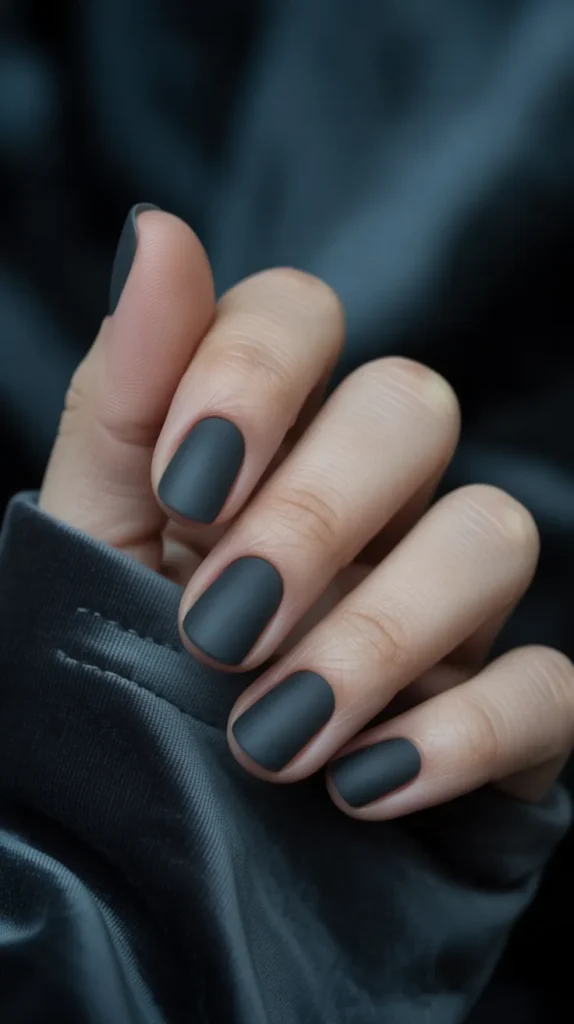 Matte deep grey nails add a moody, fashion-forward edge to neutral winter nails. The smooth finish makes them feel modern and sleek, perfect for cold-weather styling. Pair them with gold rings for an effortless contrast. 🖤