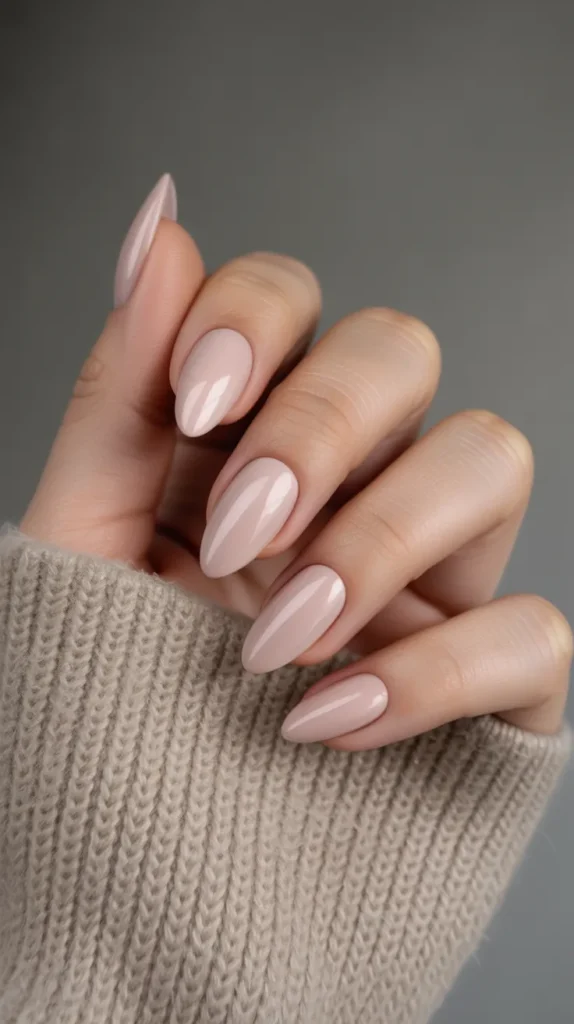 Almond blush nude nails are delicate and flattering on everyone. The blush undertone adds a soft rosy warmth that feels just right for winter nails season. Simple, glossy, and endlessly elegant the definition of classy nails charm. 🌸