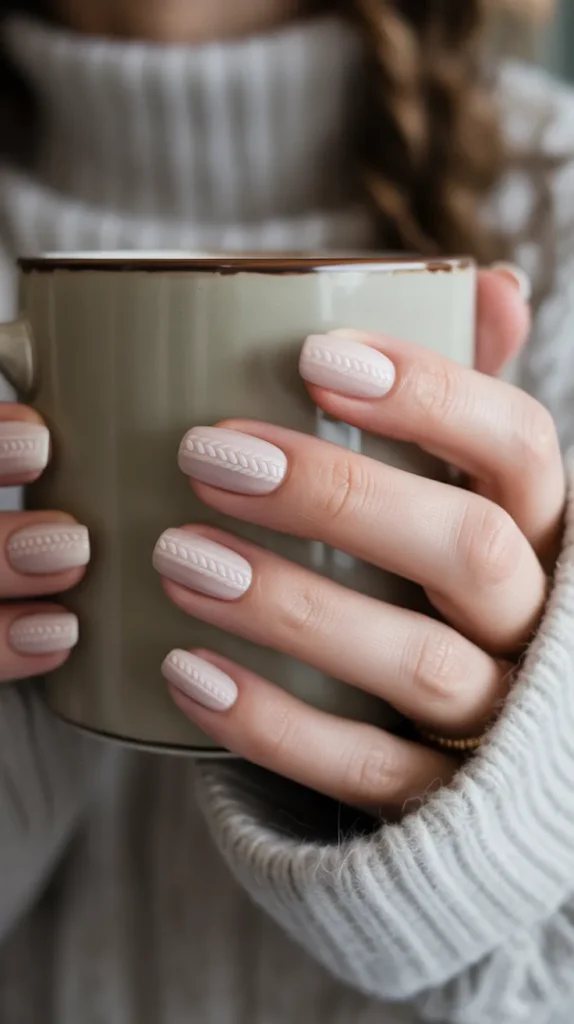 Beige sweater texture nails wrap your fingertips in cozy charm. The raised knit detailing looks adorable and perfectly seasonal. This design blends comfort and polish a must-try for winter nails that feel both warm and sophisticated. 🧶