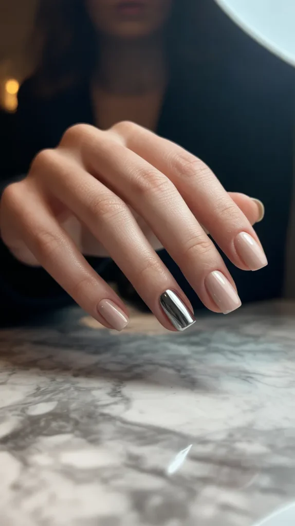 Nude chrome accent nails bring subtle glam without stealing attention. A single chrome finger adds a touch of shine to an otherwise minimal neutral winter nails look. It’s the kind of detail that makes people look twice simple yet striking. ✨