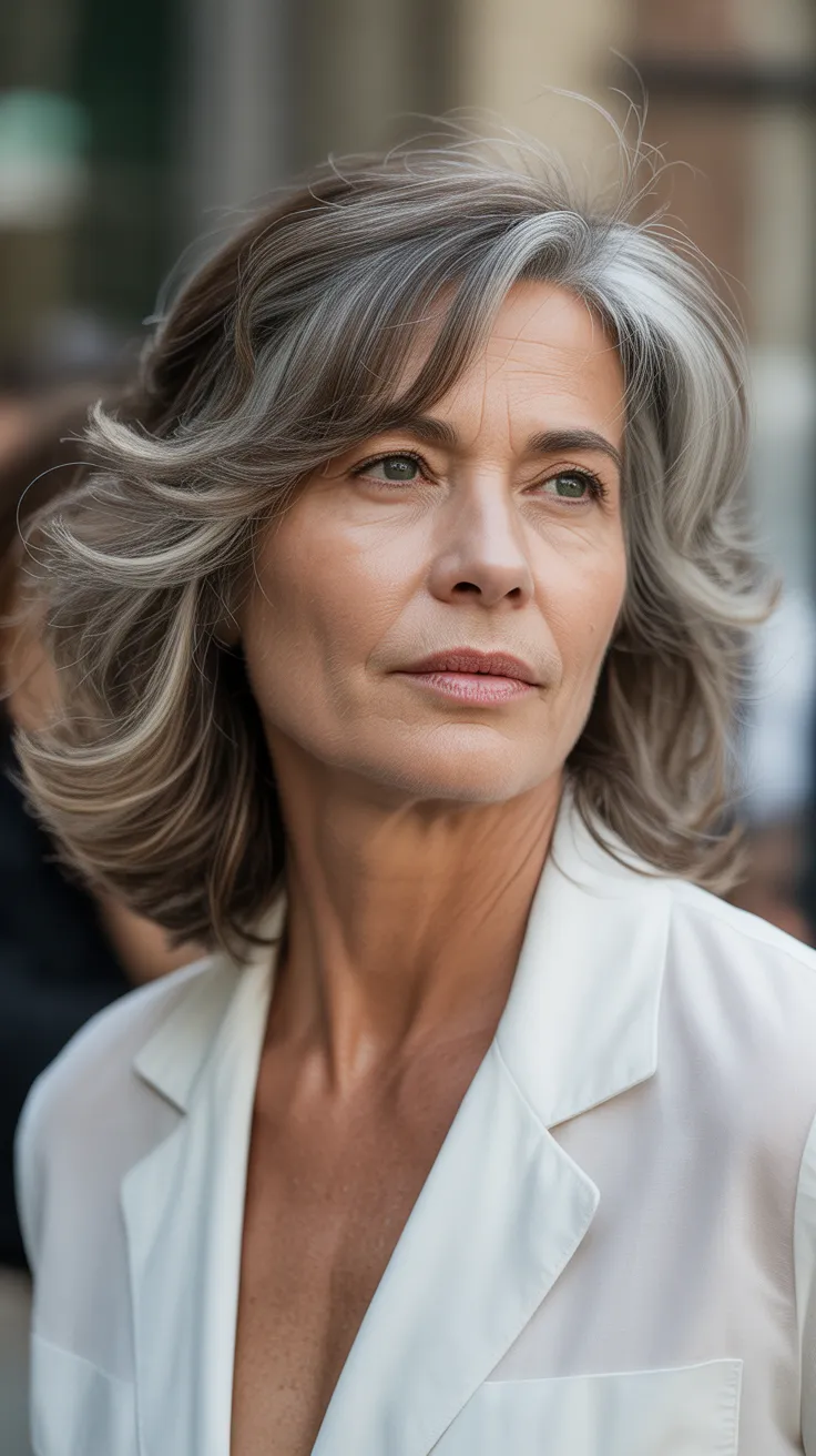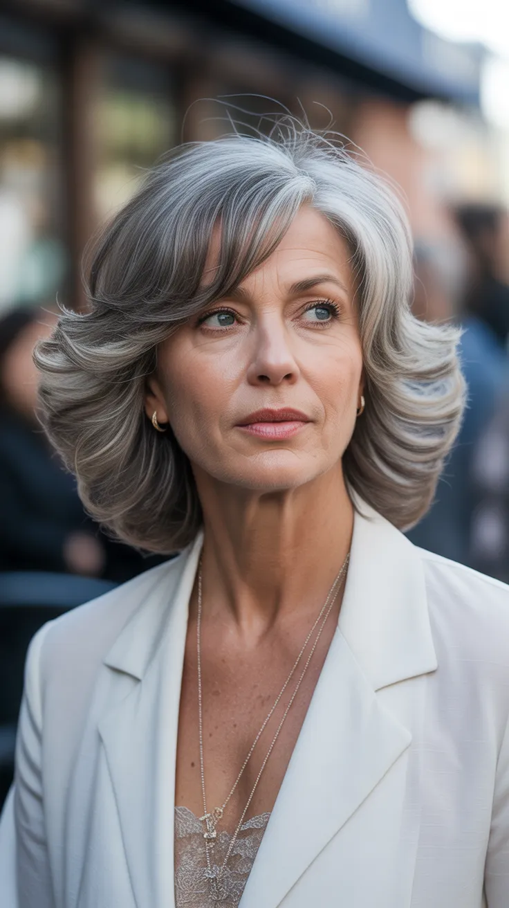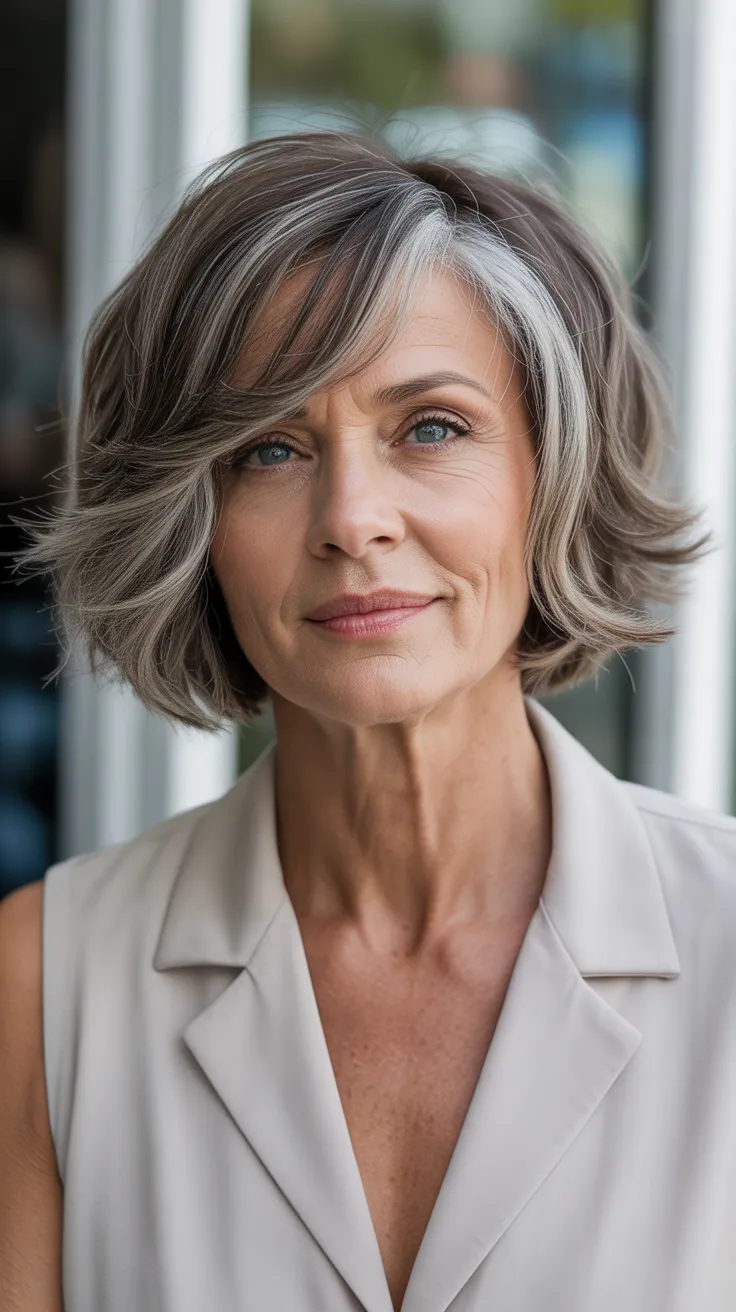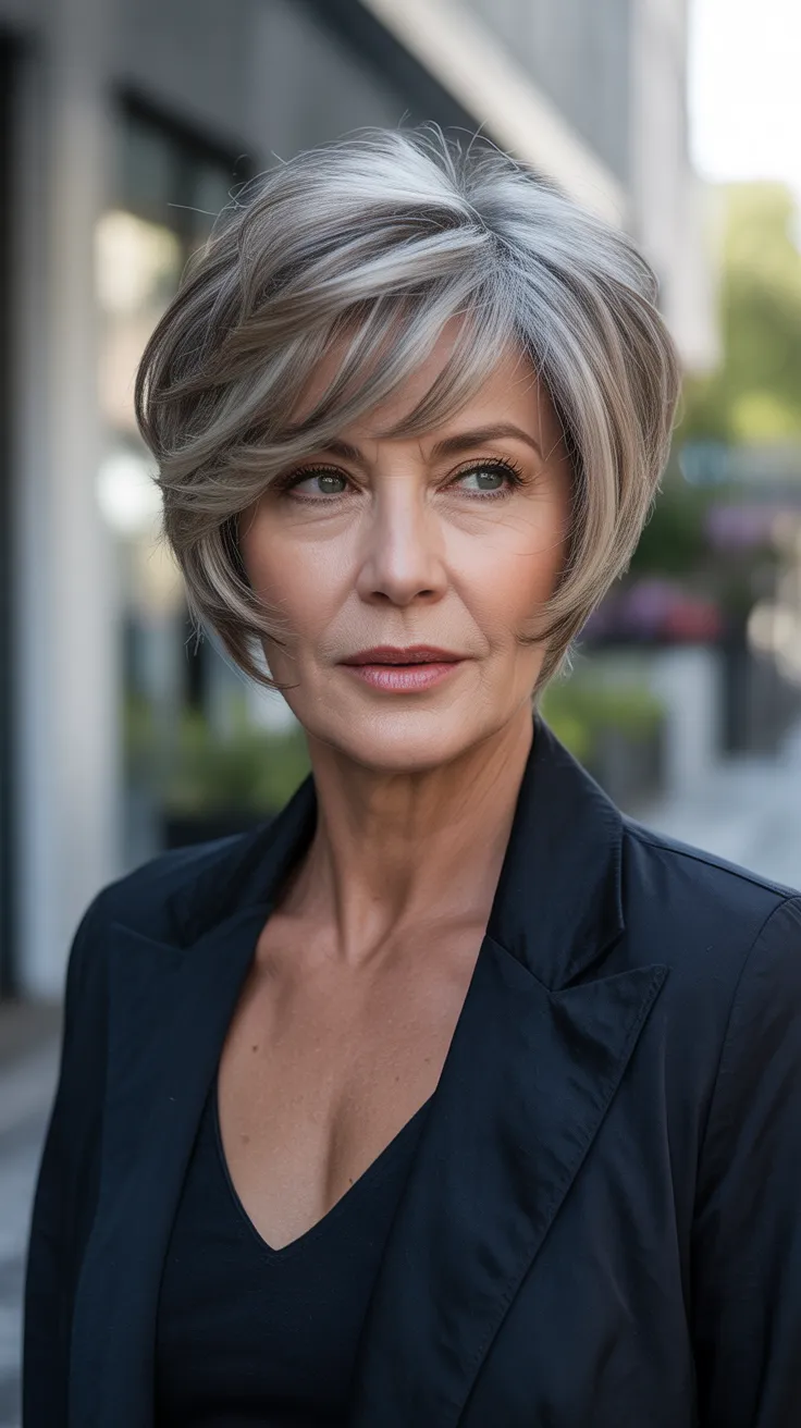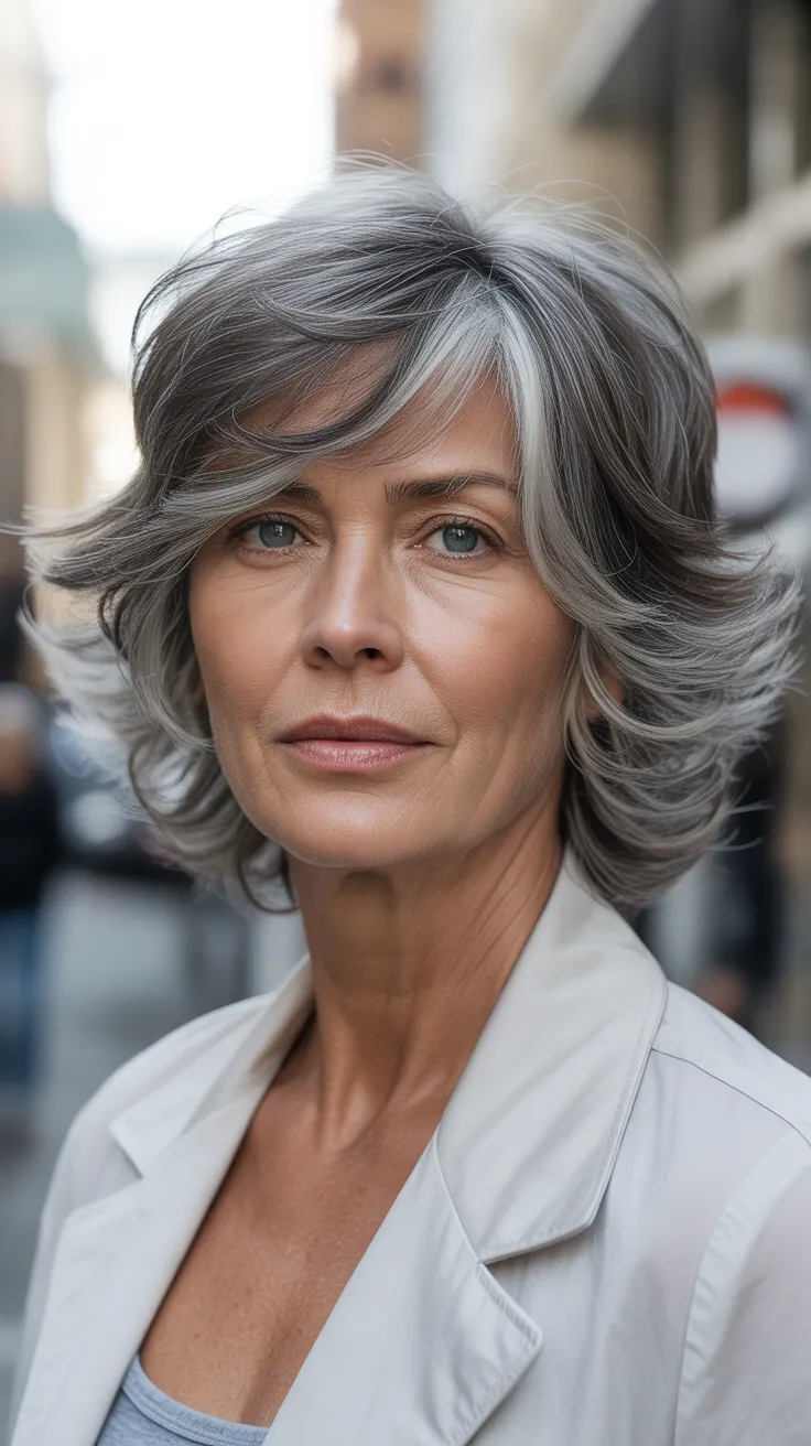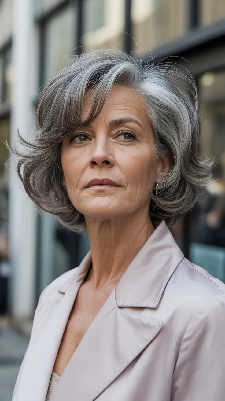 In the image, we see a woman sporting this chic haircut, showcasing its flattering nature. The layers are expertly cut to enhance her features, while the side-swept bangs soften her look. This hairstyle is perfect for those embracing fashion over 50, proving that age is just a number when it comes to style.