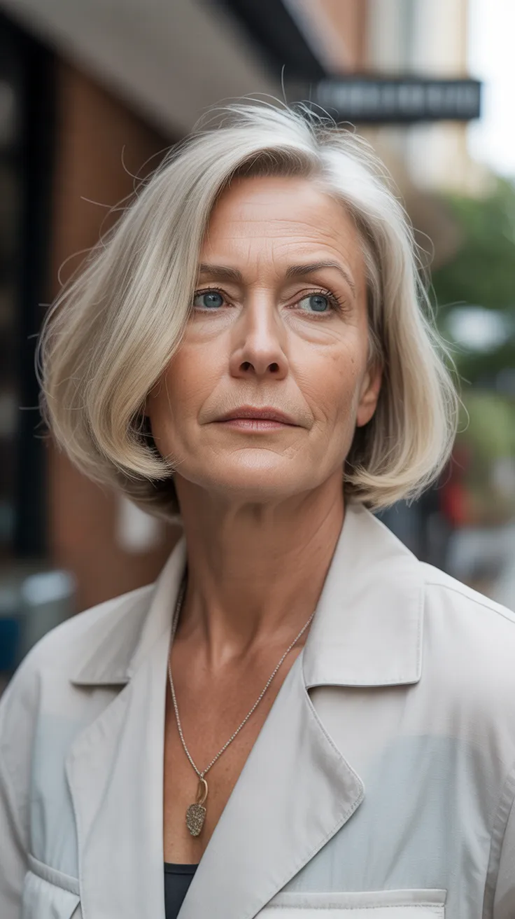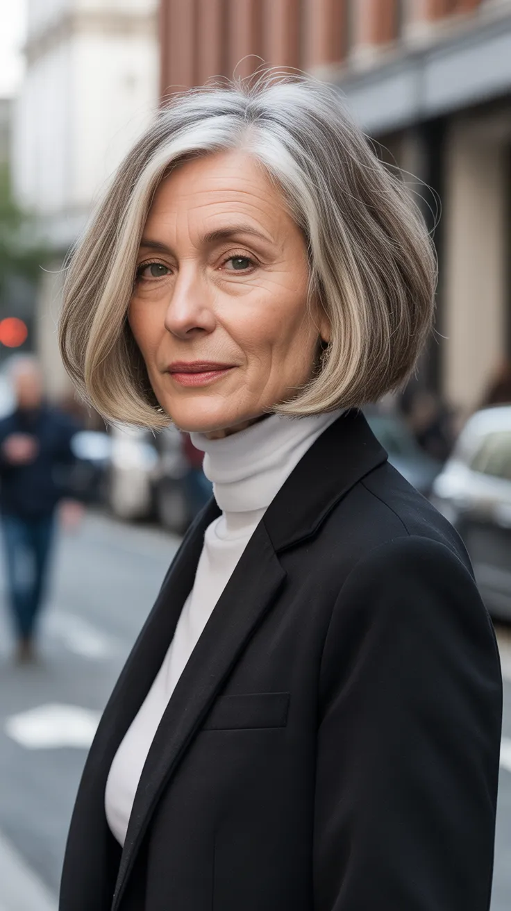 In the image, the model showcases this hairstyle perfectly. Her sleek bob falls just above the shoulders, emphasizing her features. The blunt cut gives a polished appearance, while the soft waves add a touch of movement. This style is not only trendy but also flattering, making it a great option for those embracing fashion over 50.