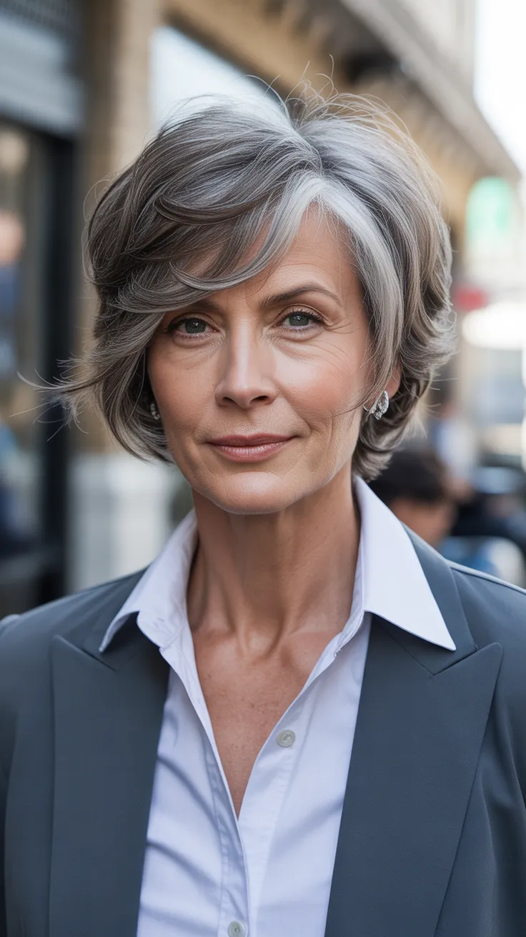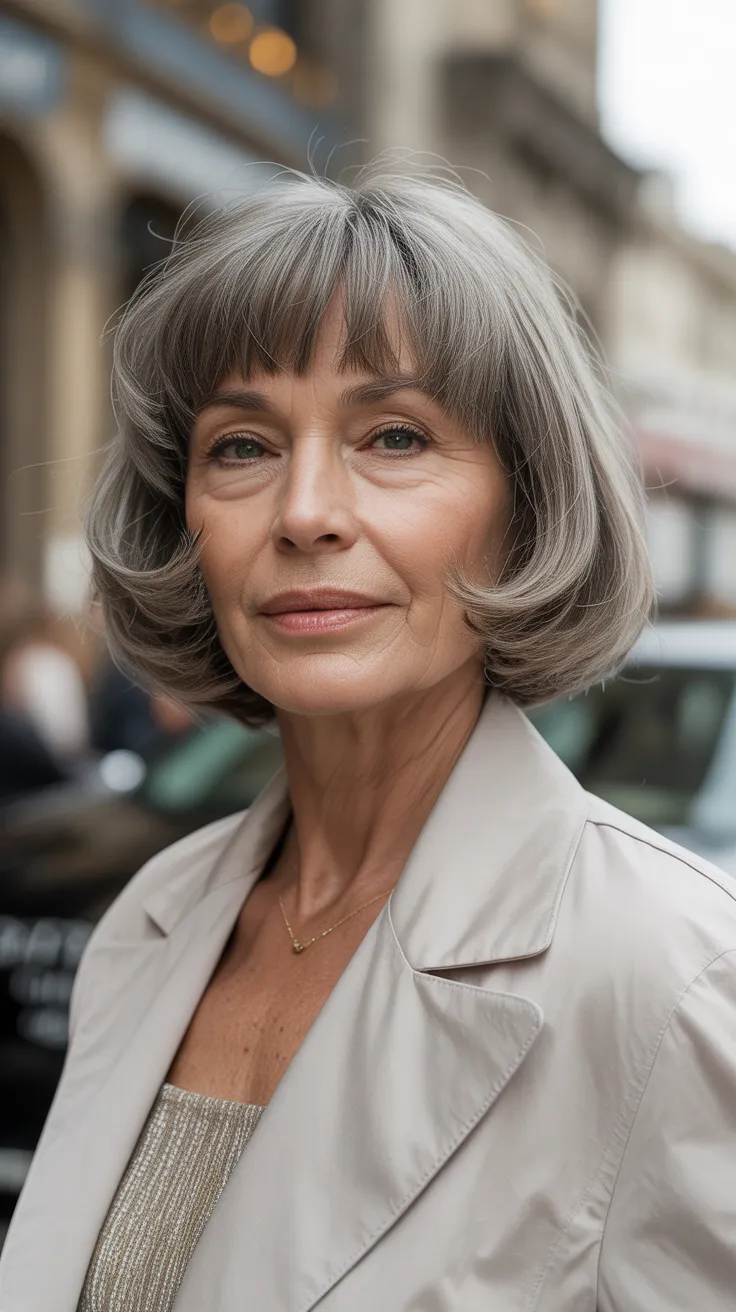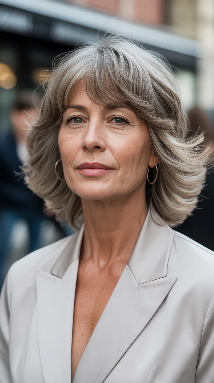 In the image, the woman showcases this chic hairstyle, with her soft bangs softly grazing her forehead. The tapered layers around her face add dimension and softness, enhancing her natural beauty. This look is perfect for those embracing ageless beauty and wanting to feel confident at any age.