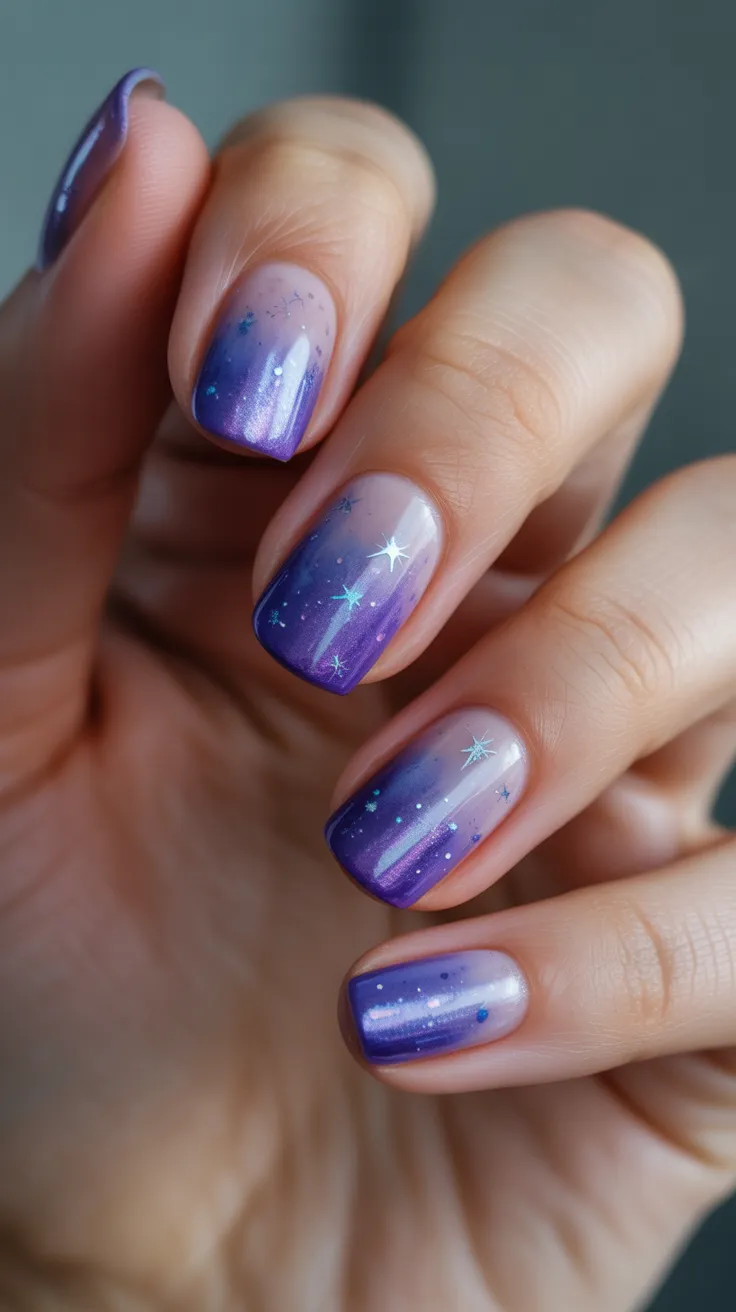 For those looking to recreate this look, start with a base coat to protect your nails. Use a makeup sponge to apply the purple and blue polishes, blending them together for that ombre effect. Finish with a top coat to seal in the design and add shine. Don’t forget to sprinkle on some glitter for that stardust effect!
