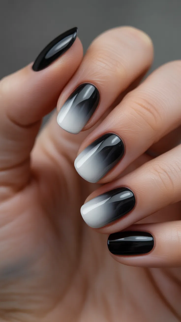 To achieve this look, you can use a sponge technique for blending the colors seamlessly. Start with a base coat, apply black polish, and then layer white at the base, blending them together. Finish with a top coat for shine and durability. This design is not just stylish; it’s also versatile, fitting for both casual and formal occasions.
