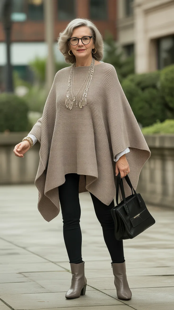 For those who love boho style outfits, this look fits right in. The poncho can be layered over classic dresses for older women, giving a modern twist to timeless pieces. Accessorizing with simple jewelry or a wide-brimmed hat can elevate the outfit even more.