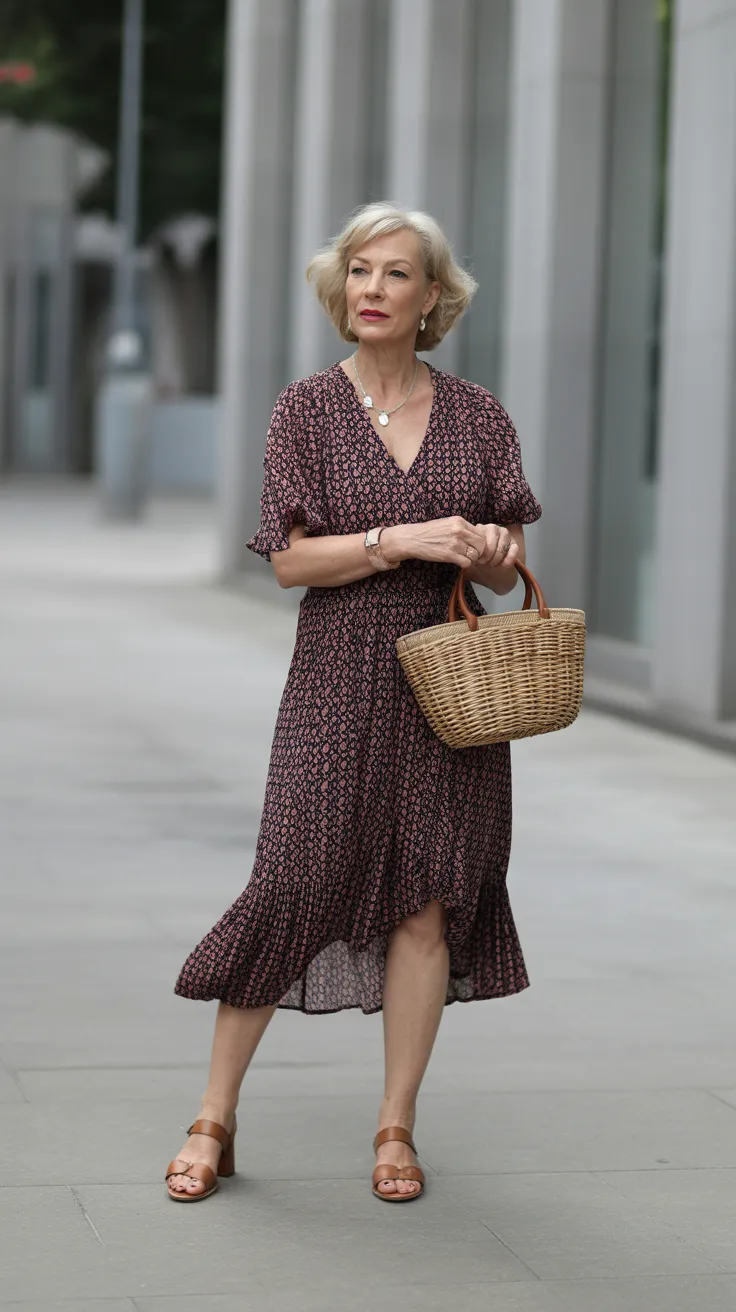 Classic dresses for older women like this one showcase how effortless style can be. The combination of the dress and sandals creates a laid-back yet polished look, ideal for over 50 women’s fashion. Whether you’re heading to brunch or a casual evening out, this outfit is sure to turn heads.