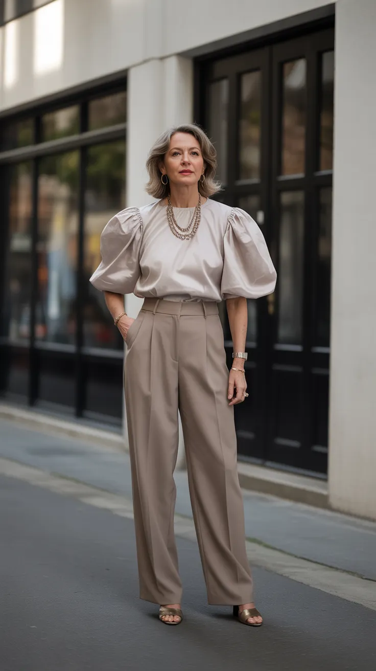 High-waisted trousers paired with a puff sleeve top create a stylish and modern look perfect for women over 50. This combination not only flatters the figure but also adds a touch of sophistication to any outfit.