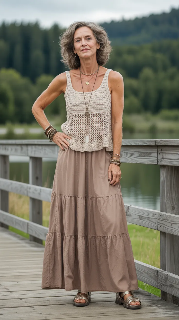 The maxi skirt and crochet tank combo is a perfect choice for women over 50 who want to embrace a chic, boho style. This look is not only stylish but also incredibly comfortable. The flowing maxi skirt in a warm, earthy tone pairs beautifully with a delicate crochet tank, creating a relaxed yet put-together vibe.