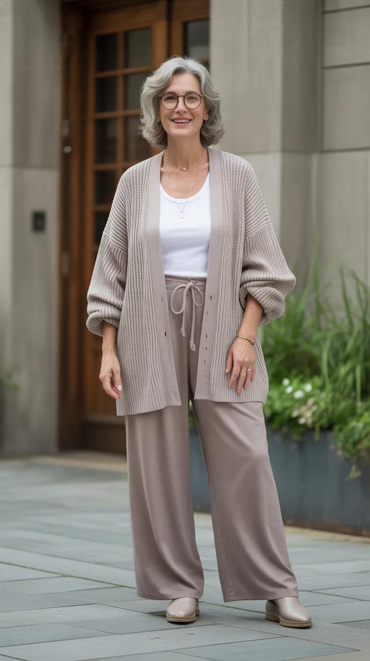 Picture this: a relaxed knit cardigan paired with wide-leg pants, creating a look that’s both chic and effortless. This combination is perfect for over 50 women’s fashion, blending comfort with style.