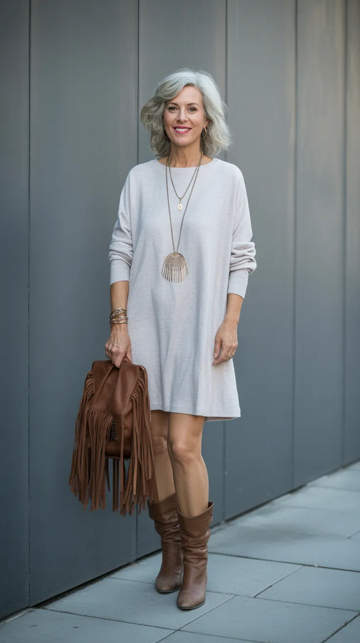 What really makes this outfit pop are the fringe accessories. The fringe adds a playful element, enhancing the boho style outfits that are so popular among over 50 women’s fashion. A chic crossbody bag and a statement necklace complete the look, making it effortlessly stylish.