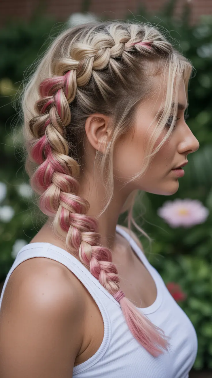 This braided ponytail is a fun mix of bold and soft vibes. The blend of blonde and pink streaks creates a playful yet chic look. The braid is neatly styled, giving it a polished finish that stands out.