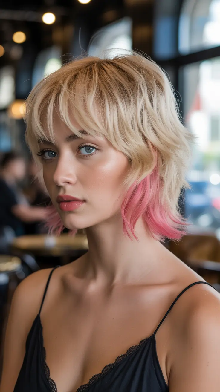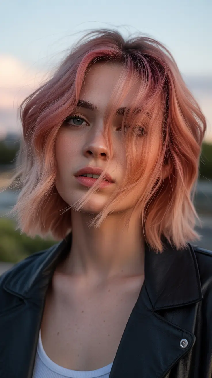 The choppy lob is a fun and trendy hairstyle that perfectly combines boldness with softness. This look features a warm blend of pink and blonde, creating a playful yet chic vibe. The layers add texture and movement, making it a great choice for anyone looking to switch things up.