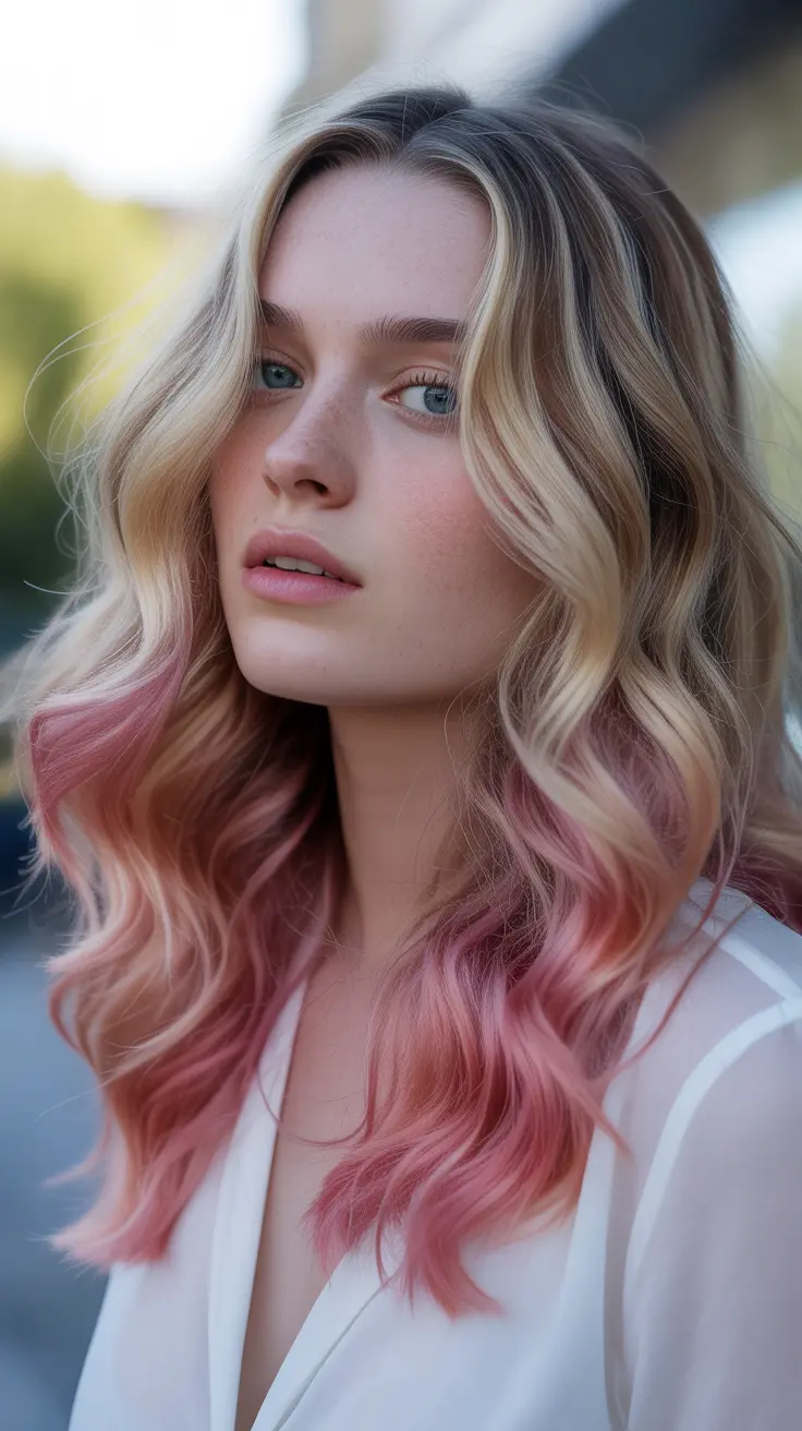 Soft waves with blended pink and icy blonde tones create a stunning look that combines boldness with elegance. This hairstyle is perfect for anyone wanting to make a statement while keeping it chic. The gentle waves add movement and texture, making the colors pop beautifully.