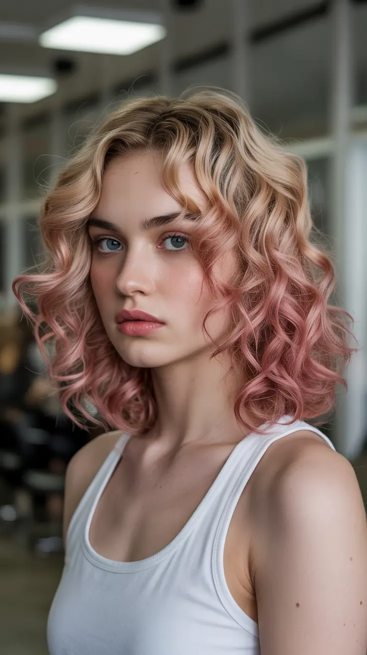 Creative hair color choices like this one can express your personality and style. Whether you’re feeling bold or just want a subtle change, mid-length curls with pink blonde marbling offer a fresh and fun vibe.