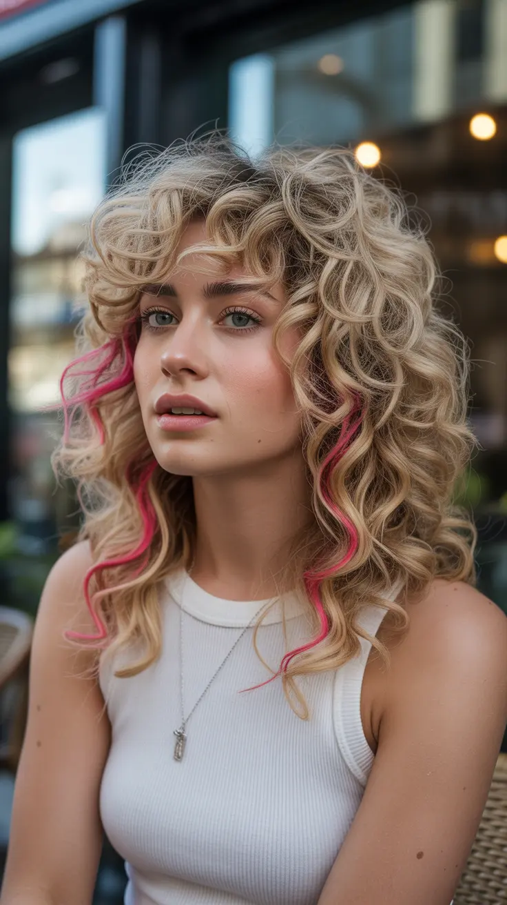 Curly blonde hair with hidden pink streaks is a fun way to express your personality. The soft curls create a romantic vibe, while the subtle pink adds a playful twist. This look is perfect for anyone wanting to blend bold color with soft glam.
